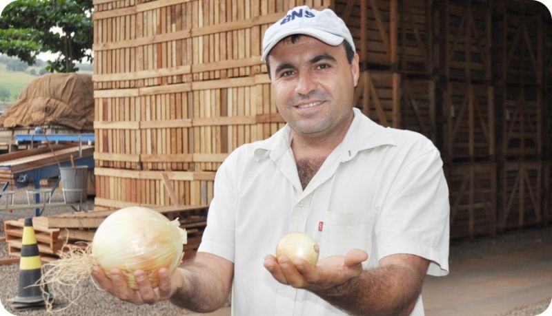 Juninho Trevisan comparando variedades de cebola plantadas no município
