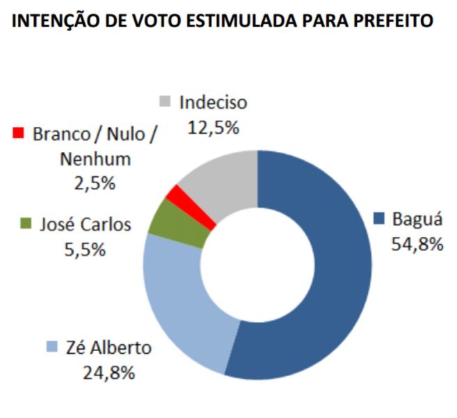 A pesquisa encomendada pelo prefeito eleito, Wesley De Santi de Melo, Baguá, divulgada às vésperas da eleição, apontaram o candidato com uma vantagem de 30% dos votos, em relação ao segundo colocado, José Alberto Bernardes Borges: Baguá, 54,8%; José Alberto, 24,8% e José Carlos com 5,5%; brancos e nulos, 2,5% e indecisos, 12,5%.