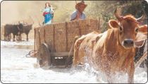 Carro de boi atravessa o rio das Velhas com Nossa Senhora do Desterro (montagem)