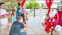 Famílias fotografam filhos com o Papai Noel, na praça da Basílica