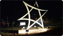 Estrela de Davi, estilizada, e a placa ao fundo com o nome da cidade e do patrono do trevo