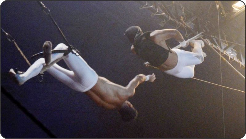 De olhos vendados, trapezista do Circo Broadway salta para ser amparado pelo companheiro