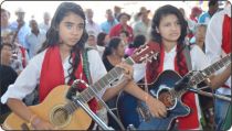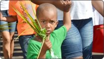 De mãos dadas à mãe e segurando ramos criança participa da Procissão de Ramos