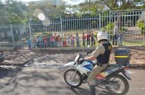 Policial cumprimenta crianças que observam passeata de dentro do jardim do Arquivo Público