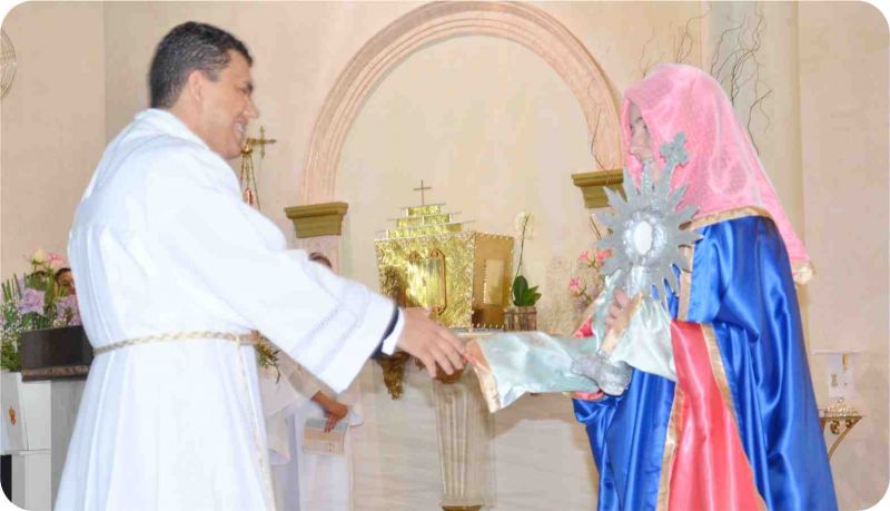 Jovem, da Pastoral da Juventude, vestida de Na. Sra. dá as boas-vindas a Pe. Paulo