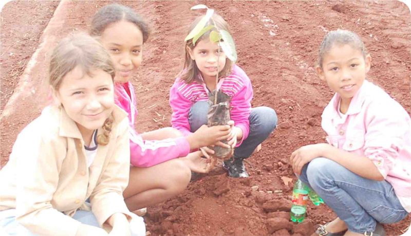 Alunas plantam árvore durante atividades ecológicas da Semana do Meio Ambiente