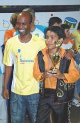 Aguisson Campos, da Unidos do Areão, recebe de Rony, torféu de campeão de melhor passista masculino infantil