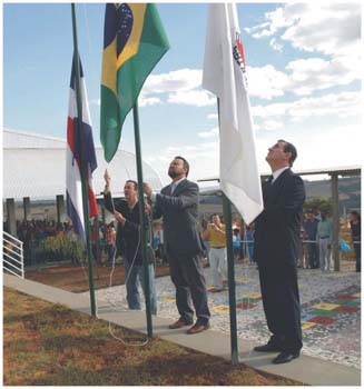 Deputado João Bittar, prefeito Joaquim e vereador José Maria Hasteiam bandeiras (no detalhe), na abertura da inauguração da Unidade do Lar Solidário de Sacramento