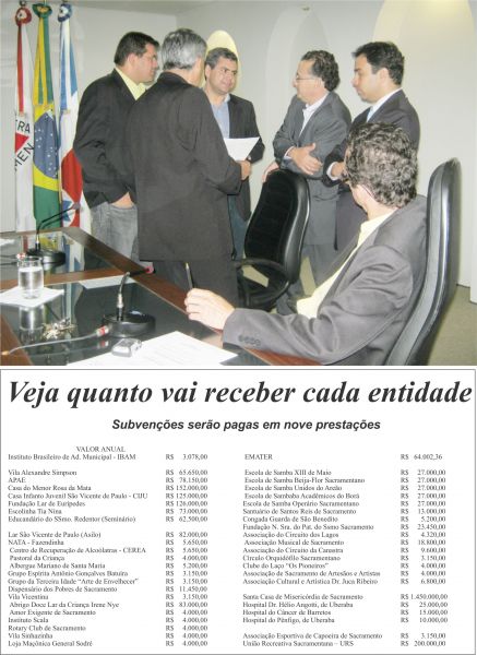 A Câmara Municipal aprovou, com emenda aditiva, o projeto de lei das subvenções às entidades e outras instituições, na última reunião, dia 28. Considerando o trabalho prestado a pacientes da cidade, pelos hospitais, de Câncer de Barretos e Hélio Angotti e Hospital do Pênfigo, os vereadores diminuíram R$ 50 mil da subvenção destinada à Santa Casa de Misericórdia de Sacramento, que receberia recursos no valor de R$ 1,5 milhão, para serem destinados a esses hospitais.