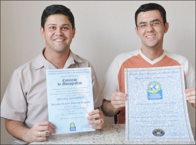 O professor Thales Ferreira Bianchini e o biólogo e gestor ambiental, da Prefeitura de Sacramento, Marinho Severino II, consagraram-se pelos excelentes trabalhos realizados, para o Concurso de Monografias, promovido pela Grande Loja Maçônica de Minas Gerais. Thales, em 2010, e Marinho, este ano, com o tema, “Água – elemento básico para a vida”. O venerável da Loja, Prof. João Bosco Martins representou os jovens na solenidade de entrega dos diplomas, no sábado, dia 24, em Belo Horizonte.